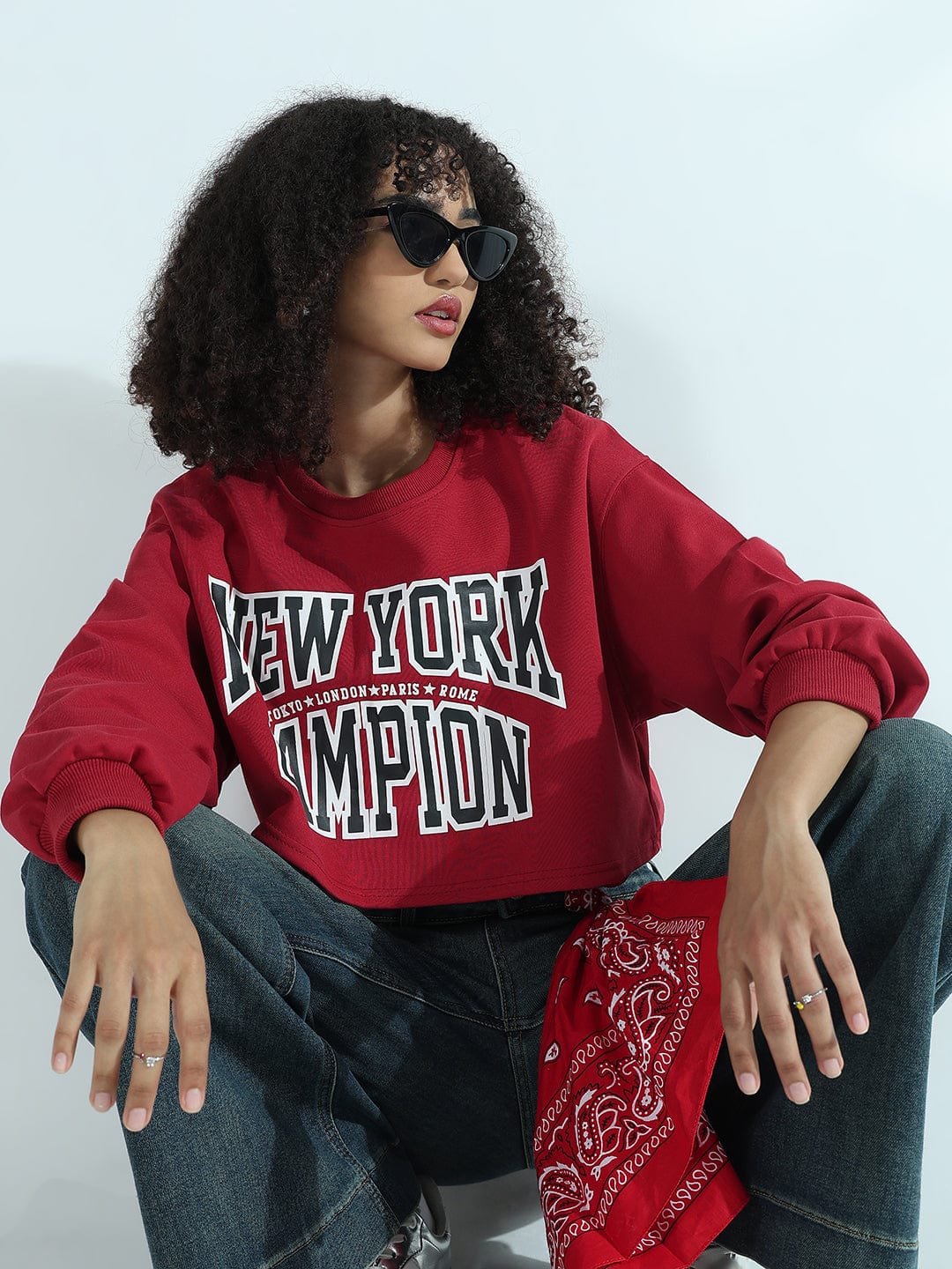Elevate your summer wardrobe with the Women's Printed Red Urban Street Style Cropped Sweatshirt Top. This vibrant cropped sweatshirt is crafted from a premium cotton blend. ensuring comfort and breathability for those warm days. With its trendy full sleeves and eye-catching typography print. this top seamlessly blends casual style with urban flair. making it a perfect choice for fashion-forward women.