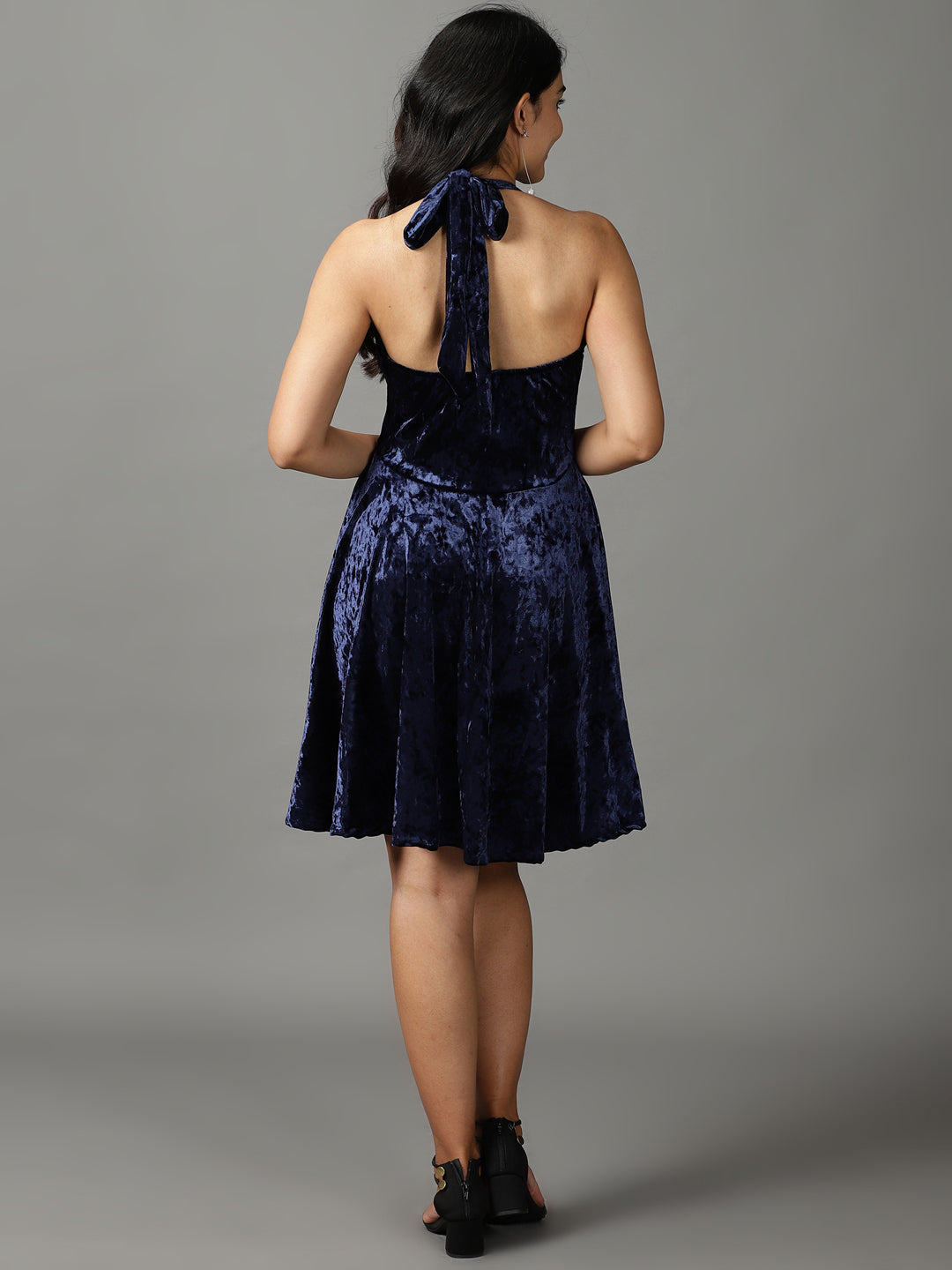 Women's Navy Blue Sheen Detailed Velvet Fit & Flare Dress
